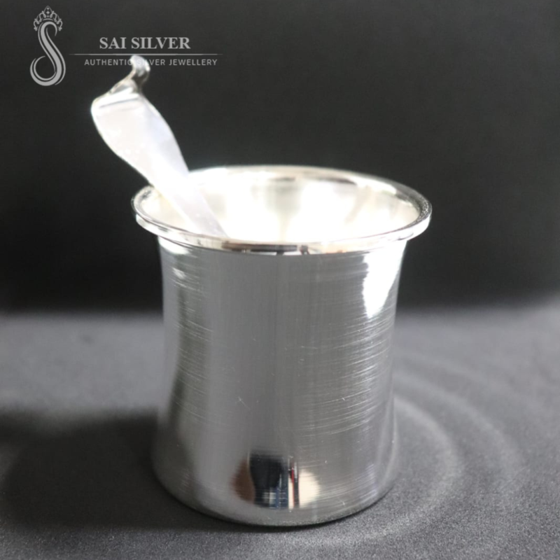 The silver chombu bears the goddess Lakshmi's impression—a symbol of wealth and prosperity. This sacred vessel, crafted from gleaming silver, holds deep spiritual significance in Hindu ceremonies. Its divine image radiates blessings and grace, making it a cherished treasure in households seeking abundance.